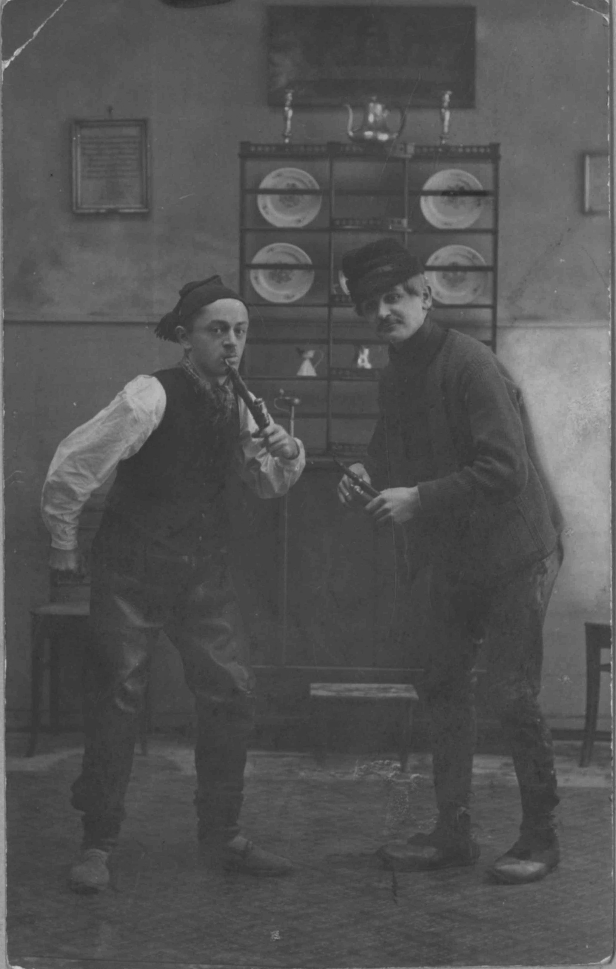 Frühzeitig betätigte sich mein Großvater mit den Werten seiner erzgebirgischen Heimat. So war er in Heimat- und Sportgruppen aktiv und verfasste Lieder und Gedichte. Dies mag dazu beigetragen haben, dass er in engeren Kontakt zu Albert Schädlich kam. Zusammen mit diesem, der auch Pate einer seiner Töchter war, trat er zu öffentlichen Theatervorführungen im dramatischen Verein in Lauter auf. In diesem Zusammenhang entstanden ,,De Lauterer Gevattern", also die Mehrzahl des von Albert Schädlich erschaffenen ,,Dr Lauterer Gevatter". Ein Foto aus dieser Zeit ... belegt sein Schaffen mit Albert Schädlich. (v. li.: Erwin Leistner, Albert Schädlich)